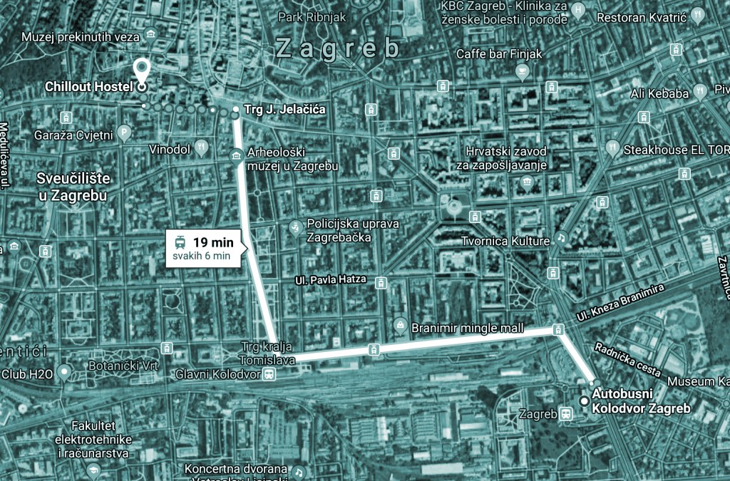 Many buses, like our sponsor Flixbus, generally arrive at The main bus station (Autobusni kolodvor Zagreb). In this case you should take the tram no. 6 (direction Črnomerec) and after 5 stops exit on Trg Bana Josipa Jelačića (the main square) and walk for 5’ to our accommodation – Chillout Hostel.
